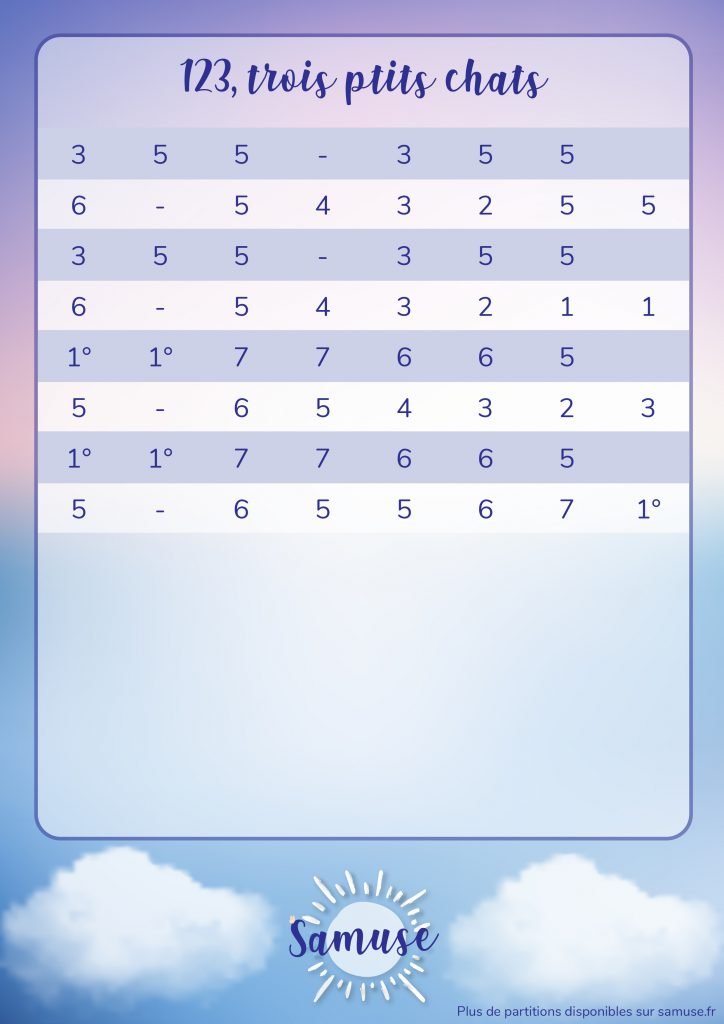 Partition Kalimba 1,2,3, trois ptits chats Partition Kalimba crée par Samuse et les Samusiens. Pour partager vos partitions avec nous, rejoignez le Discord et envoyez vos partitions sur le channel #kalimba. Previous Article Partition Kalimba Zelda Ocarina of Time - Lost Woods Next Article Kalimba : présentation et comment le choisir ?